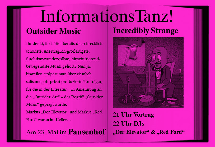 Dieses Werk und einige weitere ähnliche Sonderlichkeiten stellen Markus „Red Ford“ Hoppe und ich am Samstag, dem 23. Mai 2015 ab 21 Uhr im „Pausenhof“ (am Sternplatz Tübingen) vor. Und nach der Information wie gewohnt der Tanz!