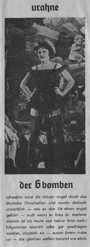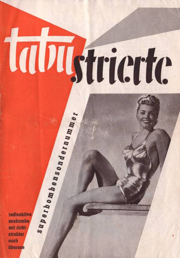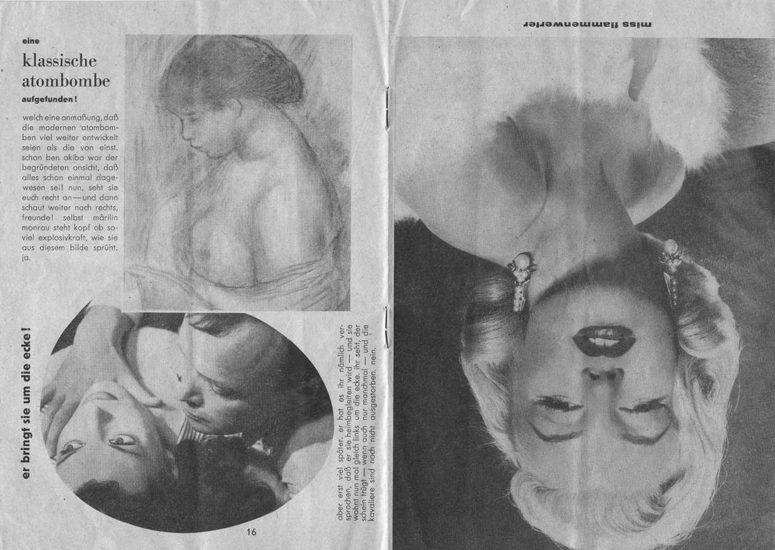 Auf der Rückseite ein satirischer Artikel zu den Vorkommnissen um den damaligen Skandalfilm „Der Apfel ist ab“ (Regie: Helmut(h) Käutner; als Adam und Eva: Bobby Todd und Bettina Moissi), der die Vertreibung aus dem Paradies satirisch thematisiert – was von Anfang an auf Widerstand von Seiten der Kirche, wohl insbesondere der katholischen, stieß. Bei den Dreharbeiten zum Film schlich sich ein junger Mann in den Mitarbeiterstab ein, der dann ein Drehbuch entwendete und sich schließlich als Münchner Jesuitenpater Gritschneder entpuppte. In der Folge kam es zu köstlichen Auseinandersetzungen zwischen Käutner und der Katholischen Kirche: